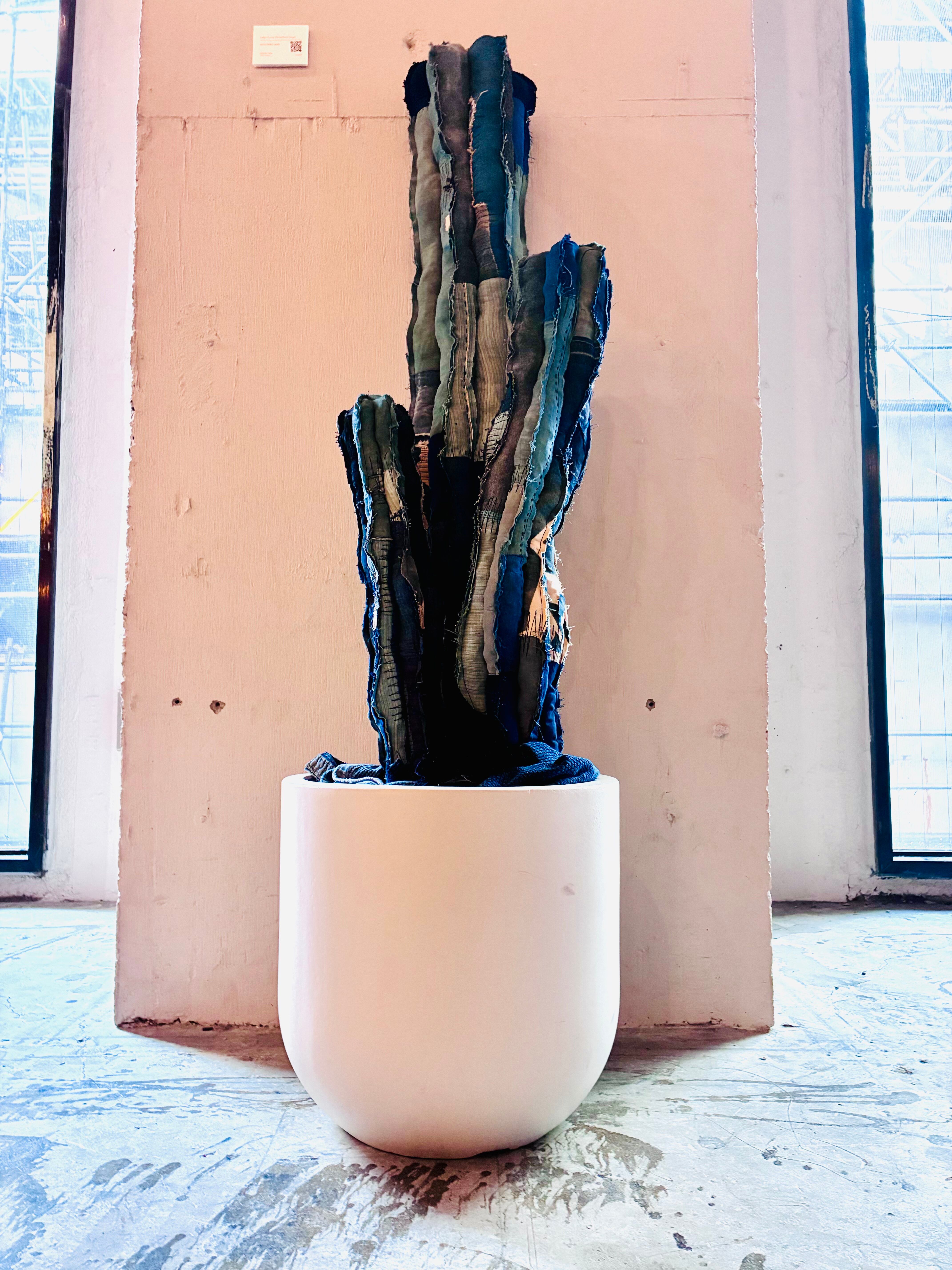 This one-of-a-kind sustainable cactus sculpture is crafted from vintage indigo-dyed “boro” textile remnants, reimagining traditional Japanese fabric culture as contemporary art. The piece embodies a zero-waste philosophy while celebrating craftsmanship, heritage, and environmental mindfulness.