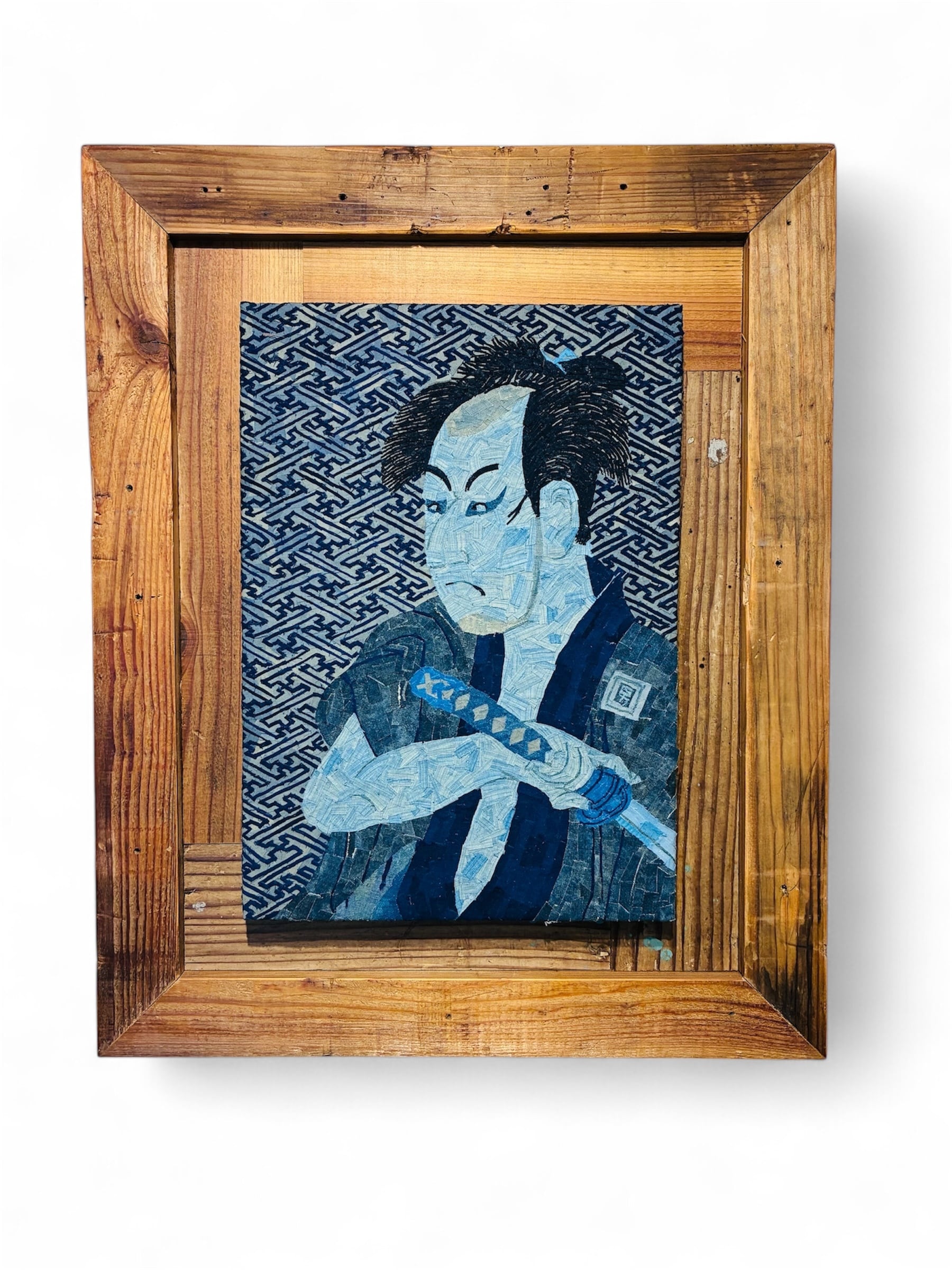 Here, Ippei’s poised stance and penetrating gaze are reconstructed using fragments of indigo-dyed boro fabric. The layered blues highlight both his dignity and the tension of loyalty under pressure. The Sayagata pattern in the background—symbolizing continuity, resilience, and prosperity—further amplifies the sense of unyielding devotion.