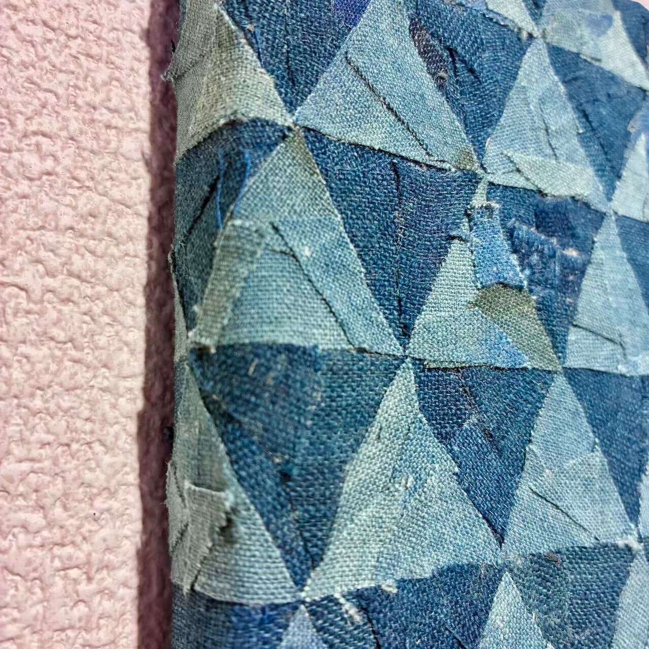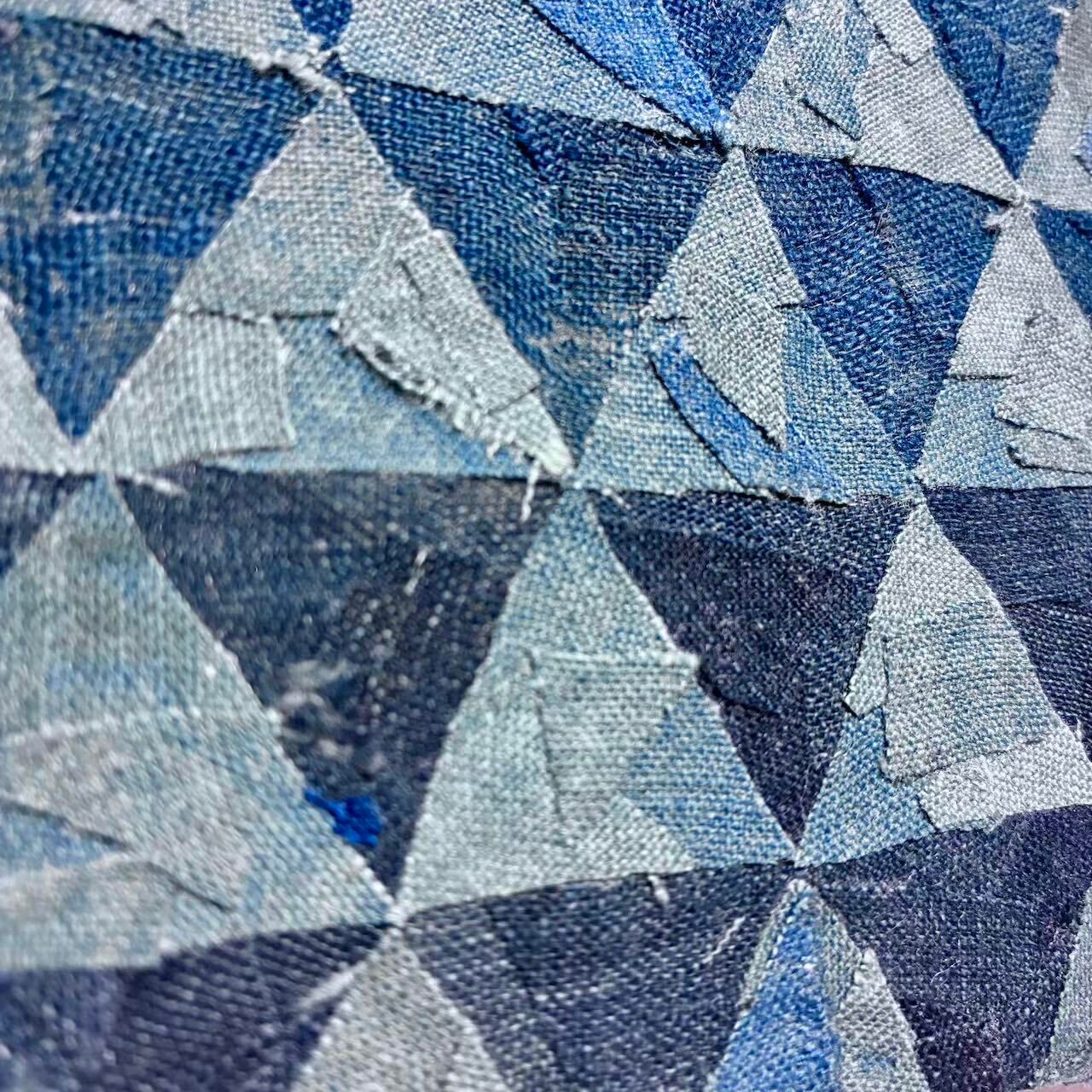 This one-of-a-kind mini artwork reinterprets the traditional Japanese Uroko (scale) pattern using fragments of vintage indigo-dyed boro fabric. The triangular motif, symbolizing protection, rebirth, and growth, has long been regarded as a talismanic design in Japanese culture.