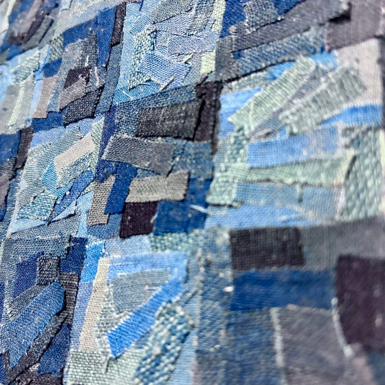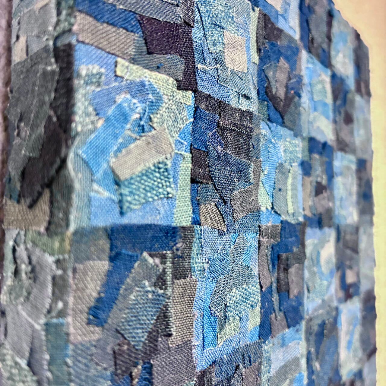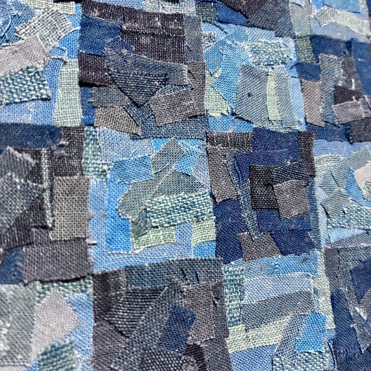 藍染の端切れを一片ずつ貼り合わせ、ペイントやプリントを用いずに布の質感と藍の濃淡だけで構成しました。異なる藍のトーンが交差しながらも調和を保つこの文様は、まるで人や時間のつながりを表すように、静かで穏やかなリズムを奏でています。