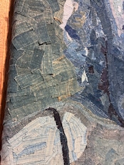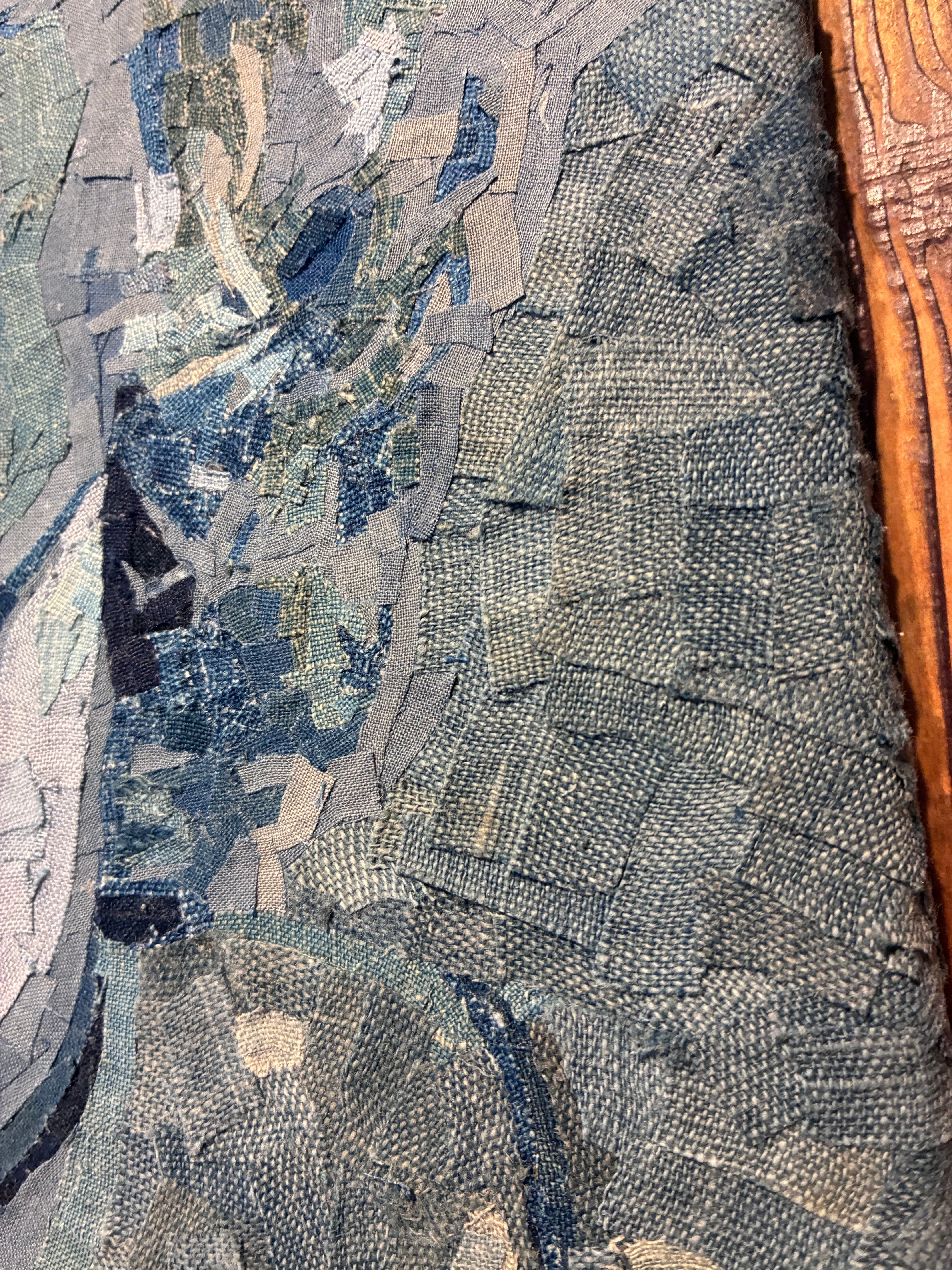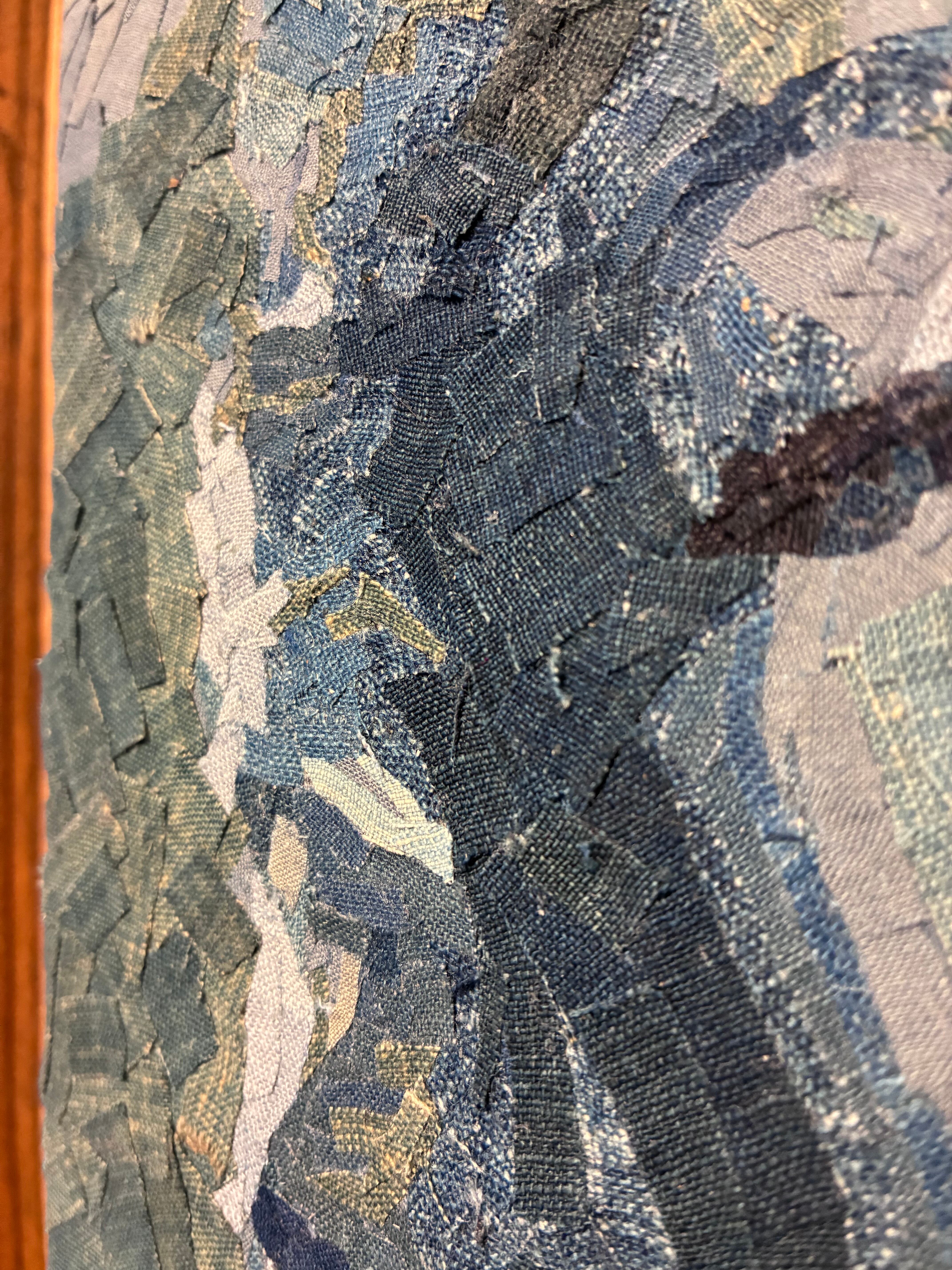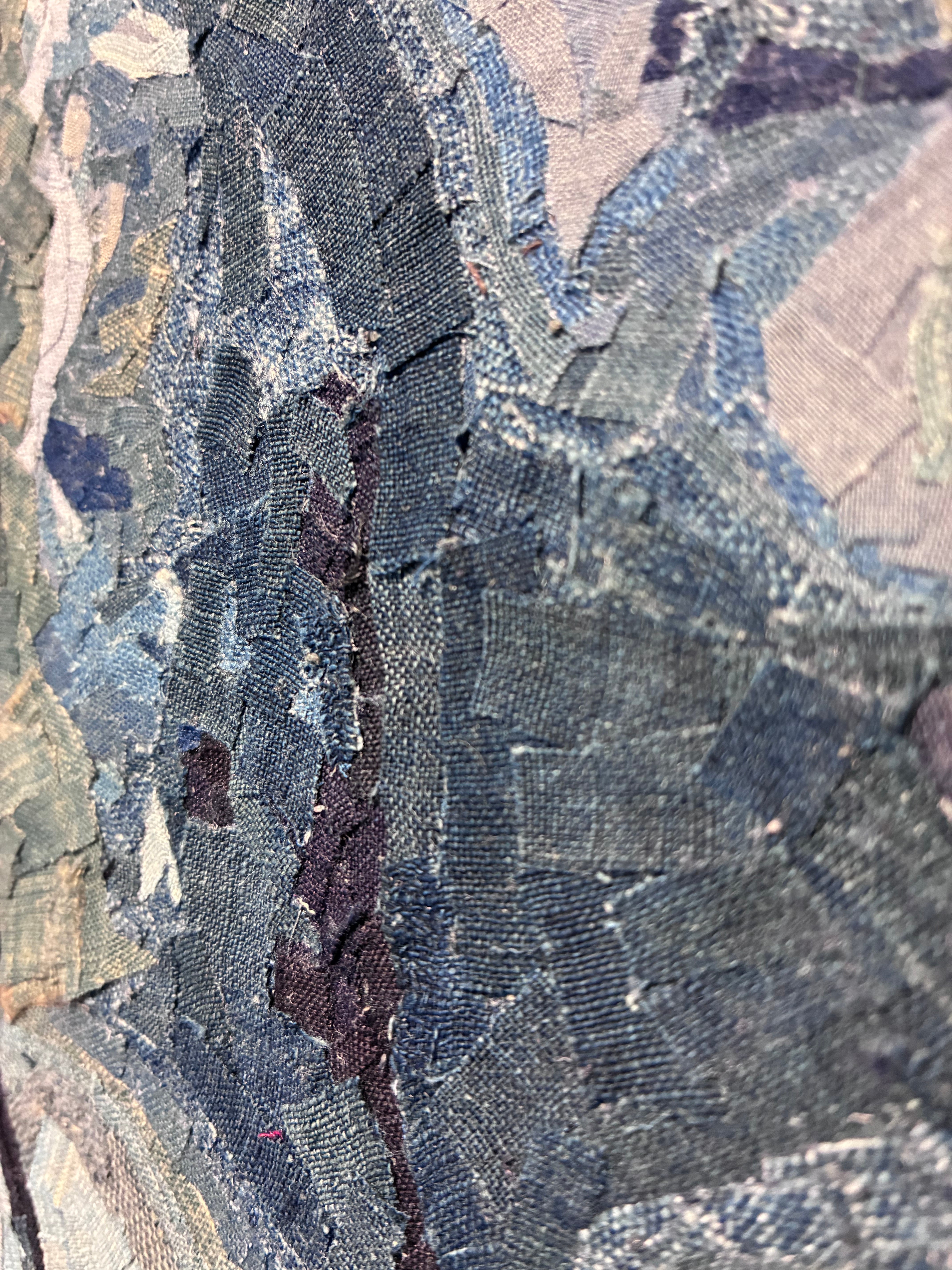 藍染布の断片を幾層にも重ねることで、微笑みの奥に宿る影、柔らかさの中にある芯の強さ、そして永遠に語り継がれる“魅惑(allure)”を表現。かつて日常の中で纏われていた着物や帯、作務衣の布片は、いまこの一枚の中で、ひとりの女性が持つ普遍的な輝きと人間味を静かに語り始めます。