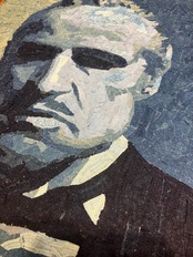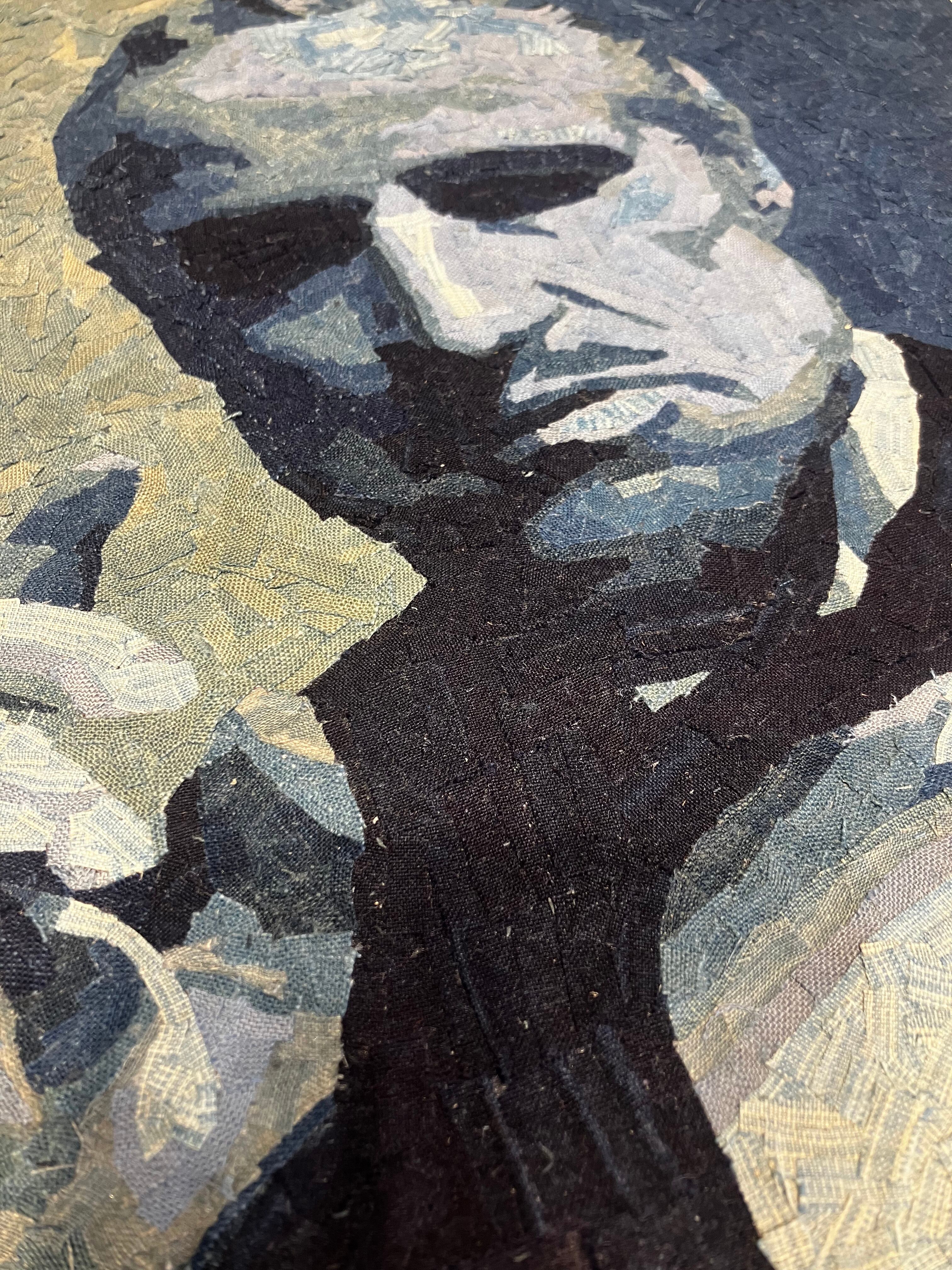 This artwork portrays Don Vito Corleone, played by Marlon Brando in The Godfather, and is created using fragments of indigo-dyed boro fabric.