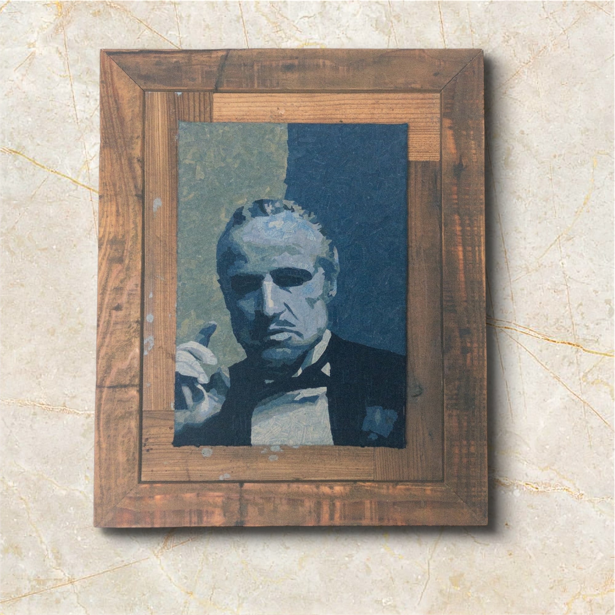 The piece is carefully crafted by adhering indigo-dyed fabric scraps onto an A3-sized wood panel (2cm thick). The deep, rich blue of the indigo dye masterfully captures the aura of dignity and power that Don Corleone embodies.