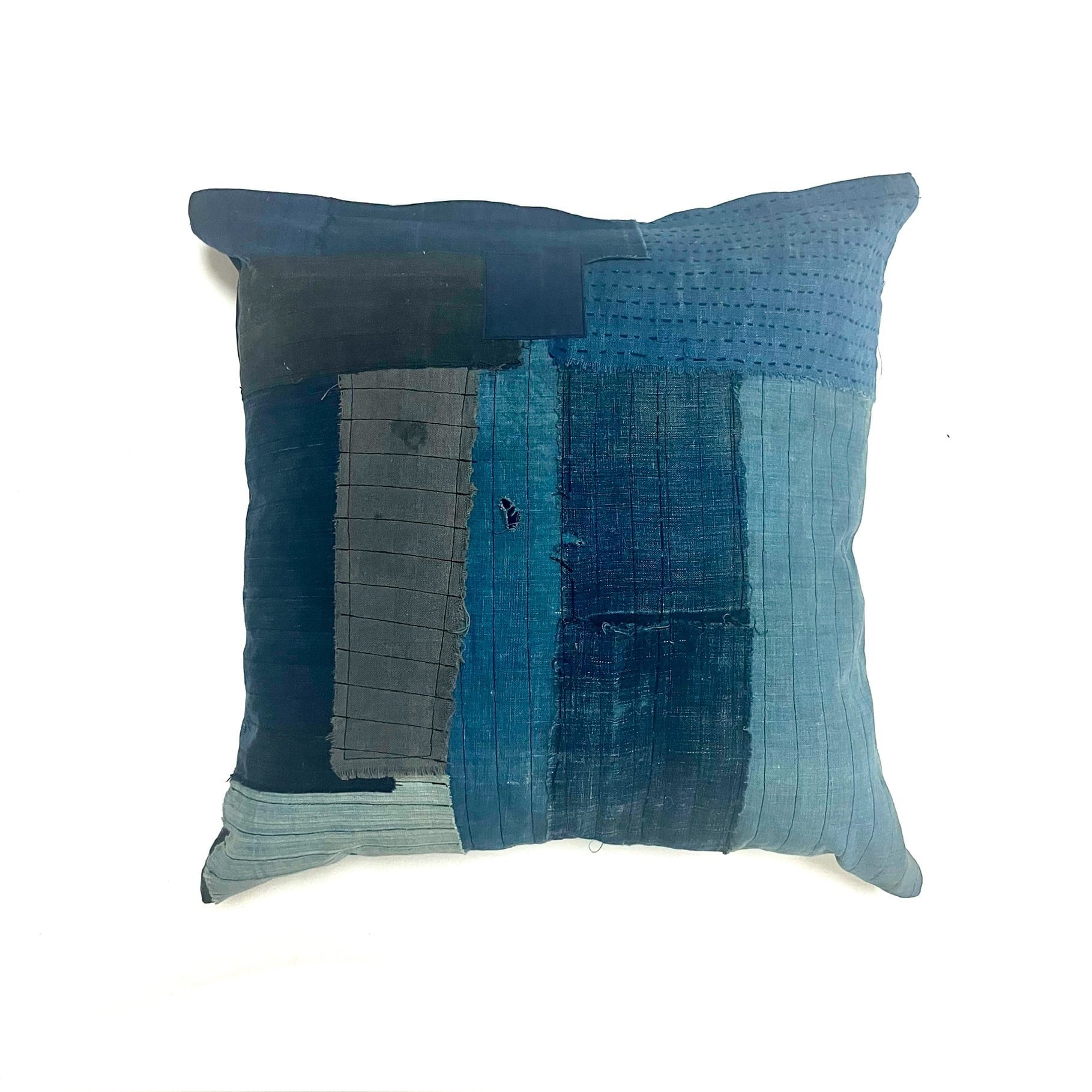 This cushion cover, crafted from rare vintage indigo-dyed boro fabric, is designed to elevate your living space. It serves as both a practical and beautiful piece of art, embodying the essence of traditional Japanese craftsmanship.