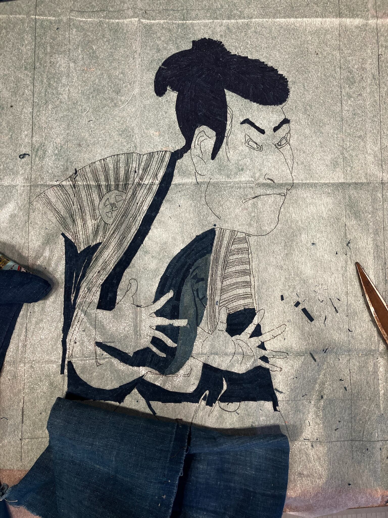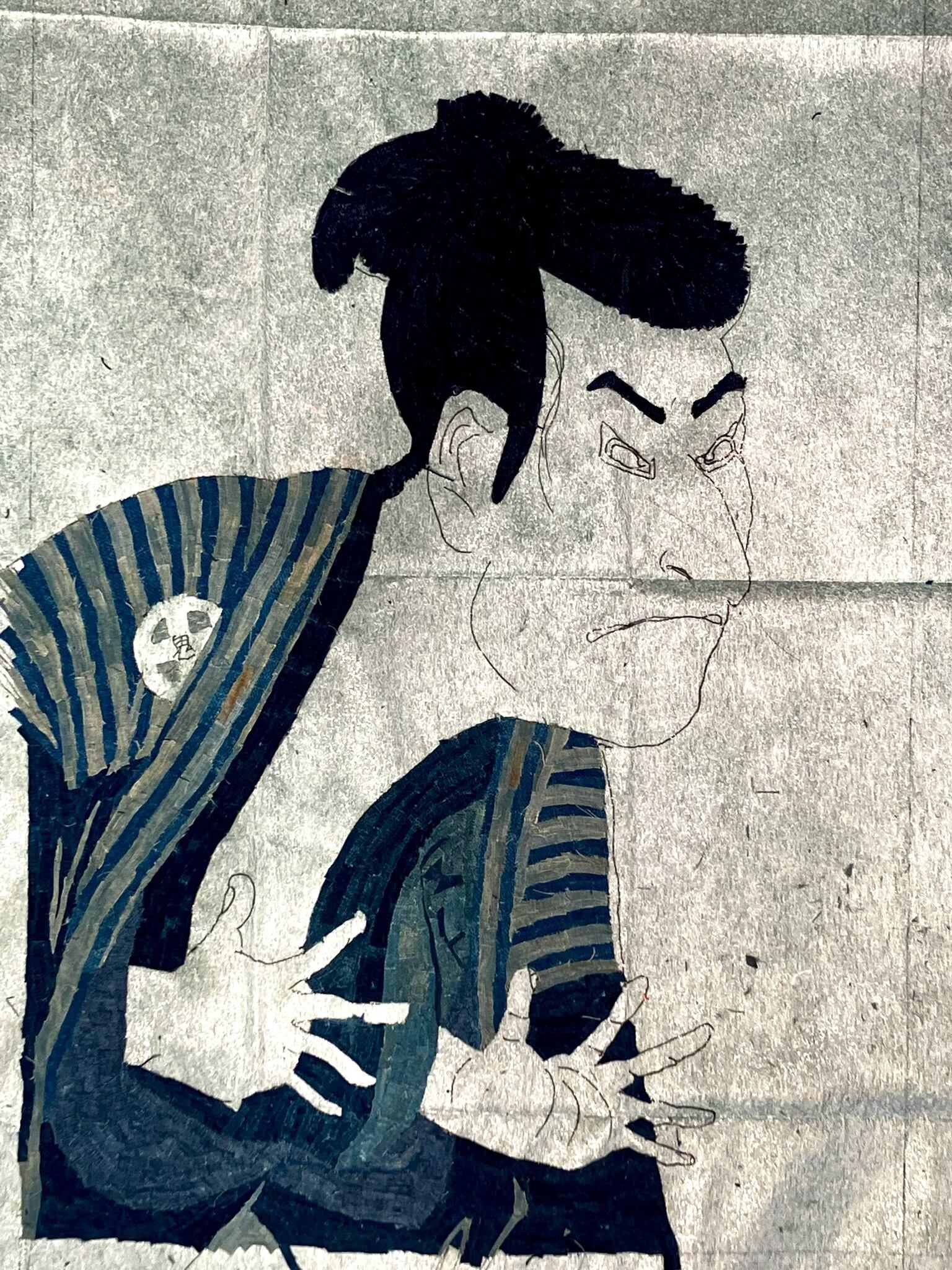 この作品は、東洲斎写楽による浮世絵《三代目大谷鬼次の江戸兵衛》をモチーフに、藍染の襤褸(ぼろ)生地を用いて制作しました。原作は、舞台上で悪役を演じる役者の荒々しさや迫力、そしてどこかユーモラスな一面を描いた傑作として知られています。