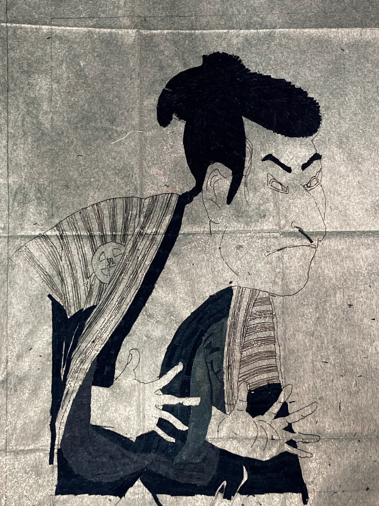 This piece is a reinterpretation of Otani Oniji III as Edohei, originally created by the ukiyo-e master Toshusai Sharaku. The original portrays a theatrical villain character—bold, intense, and at times humorously exaggerated. In this textile work, the raw energy of the figure is preserved while also expressing a sense of elegance and iki (the Edo aesthetic of refined style).