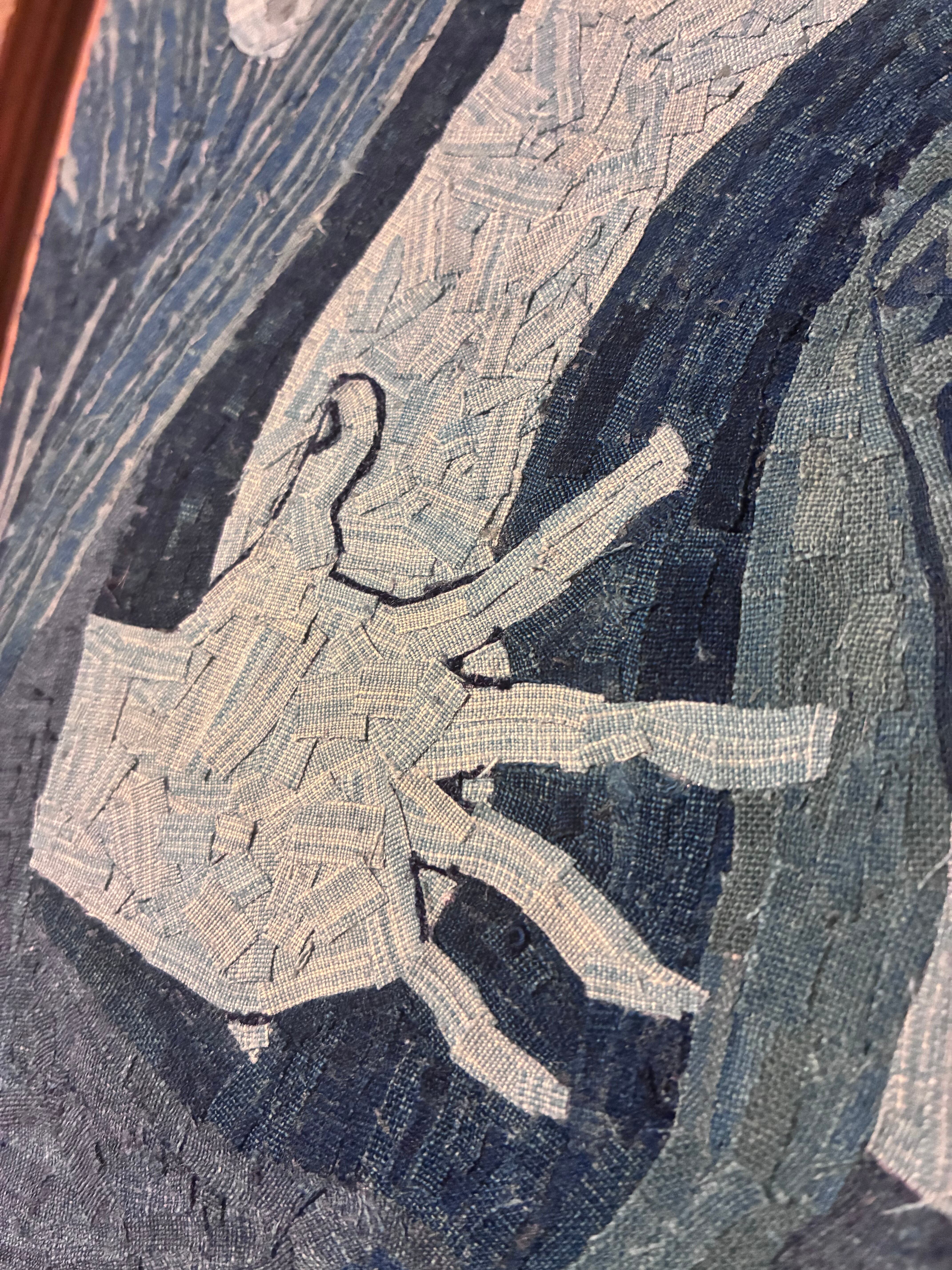 Meticulously crafted by piecing together scraps of indigo-dyed fabric, the artwork captures the impactful expressions and elegant composition of Sharaku’s masterpiece. The deep blue tones and natural textures of the indigo dye bring the piece to life, showcasing its unique beauty.