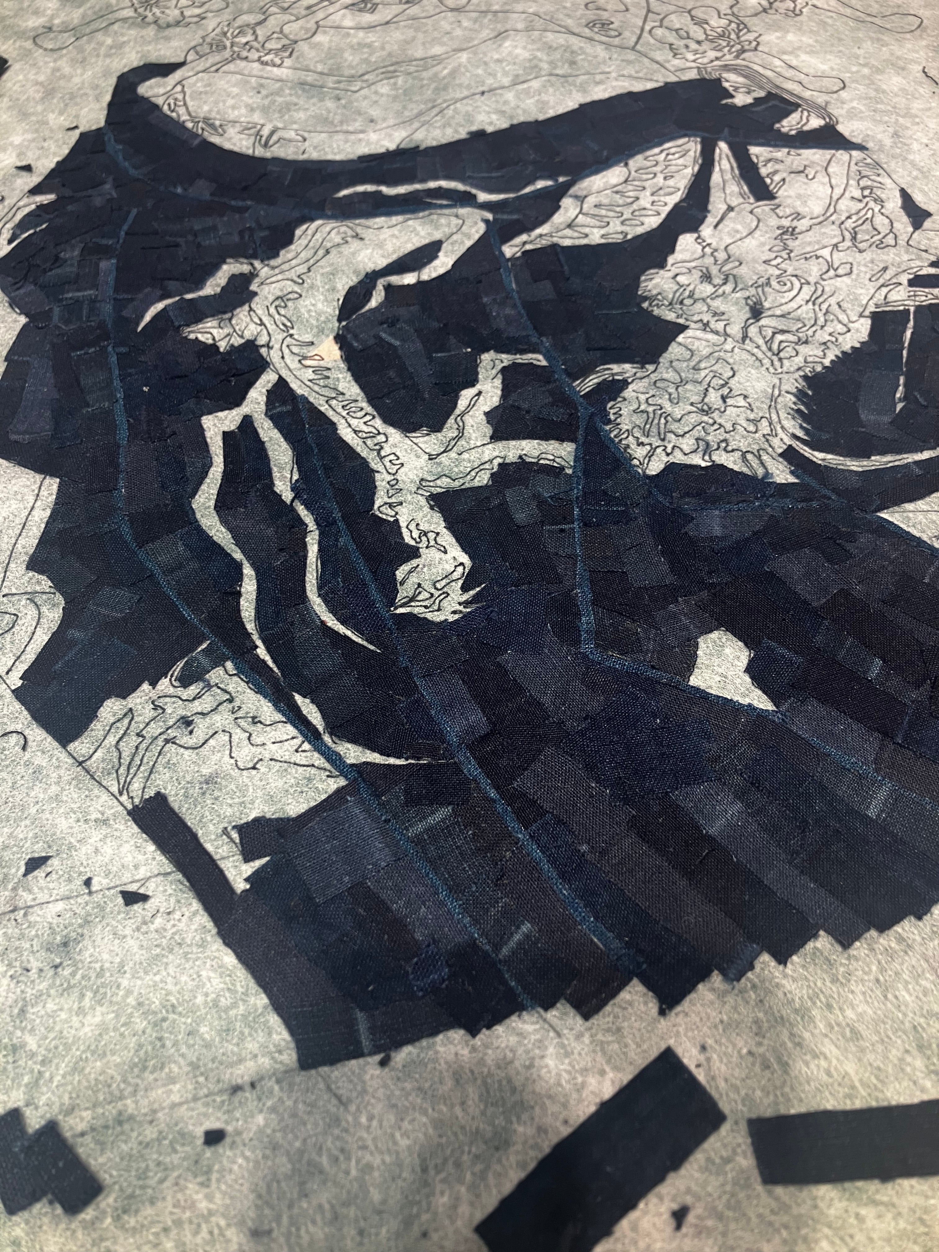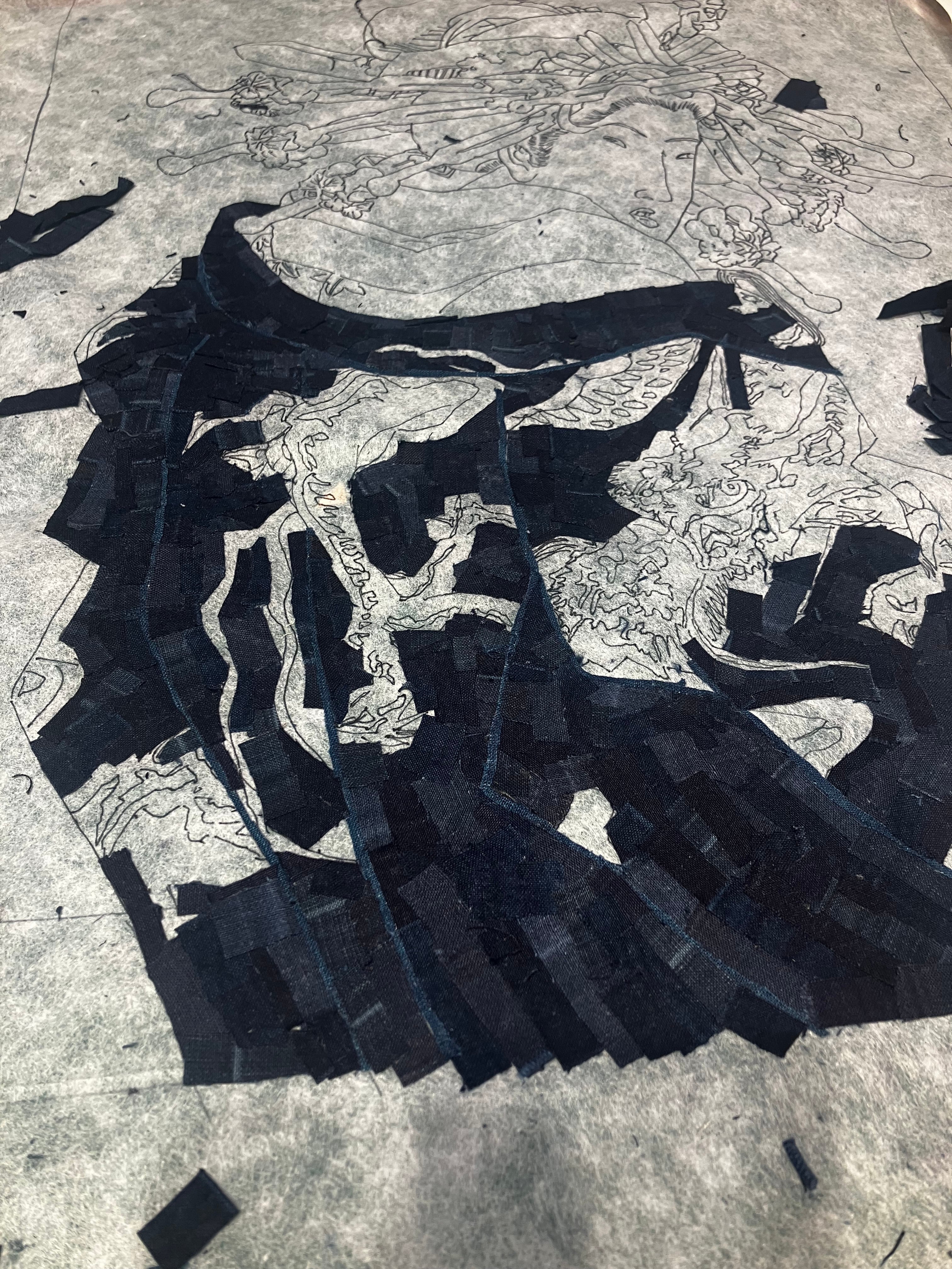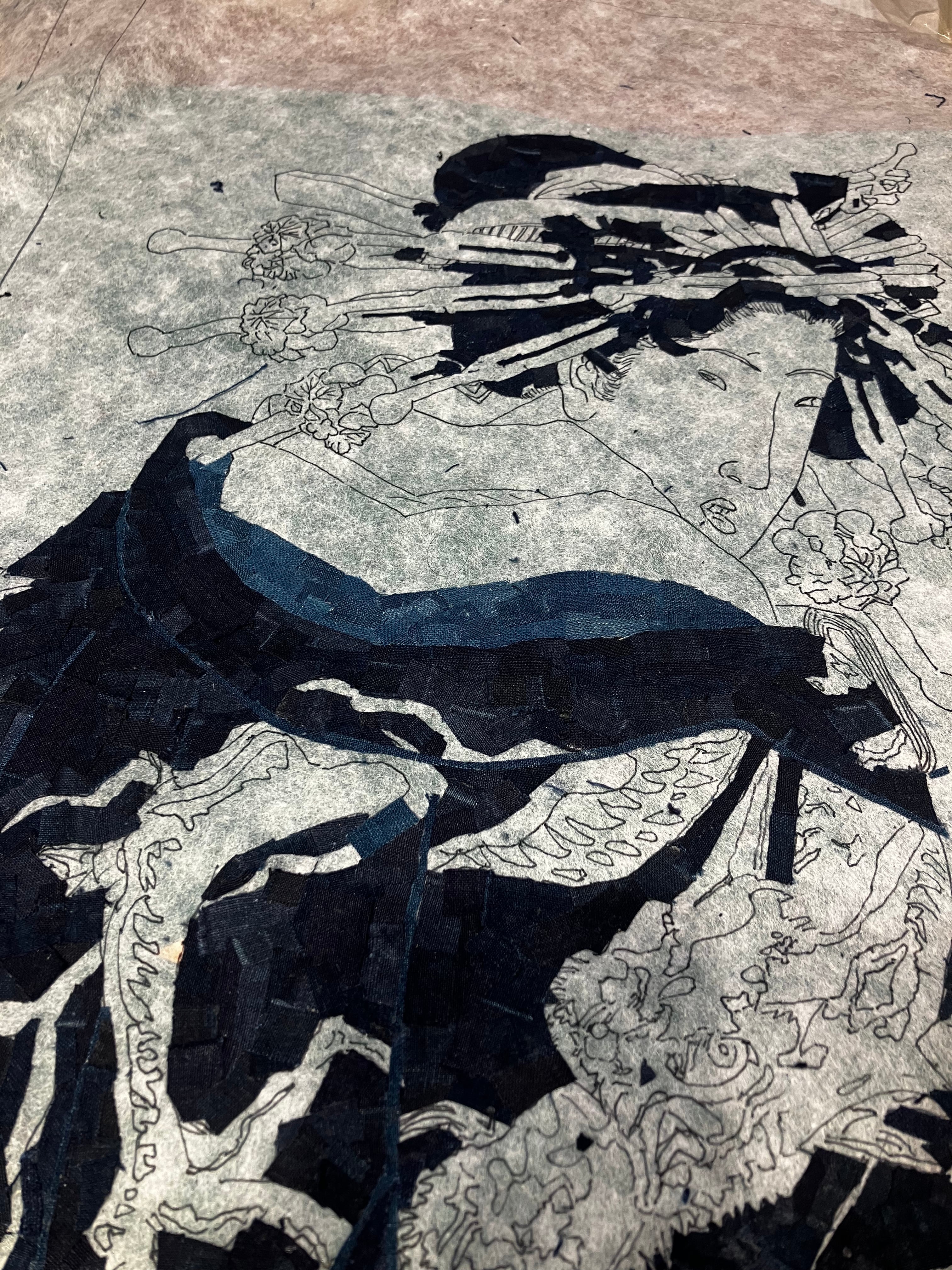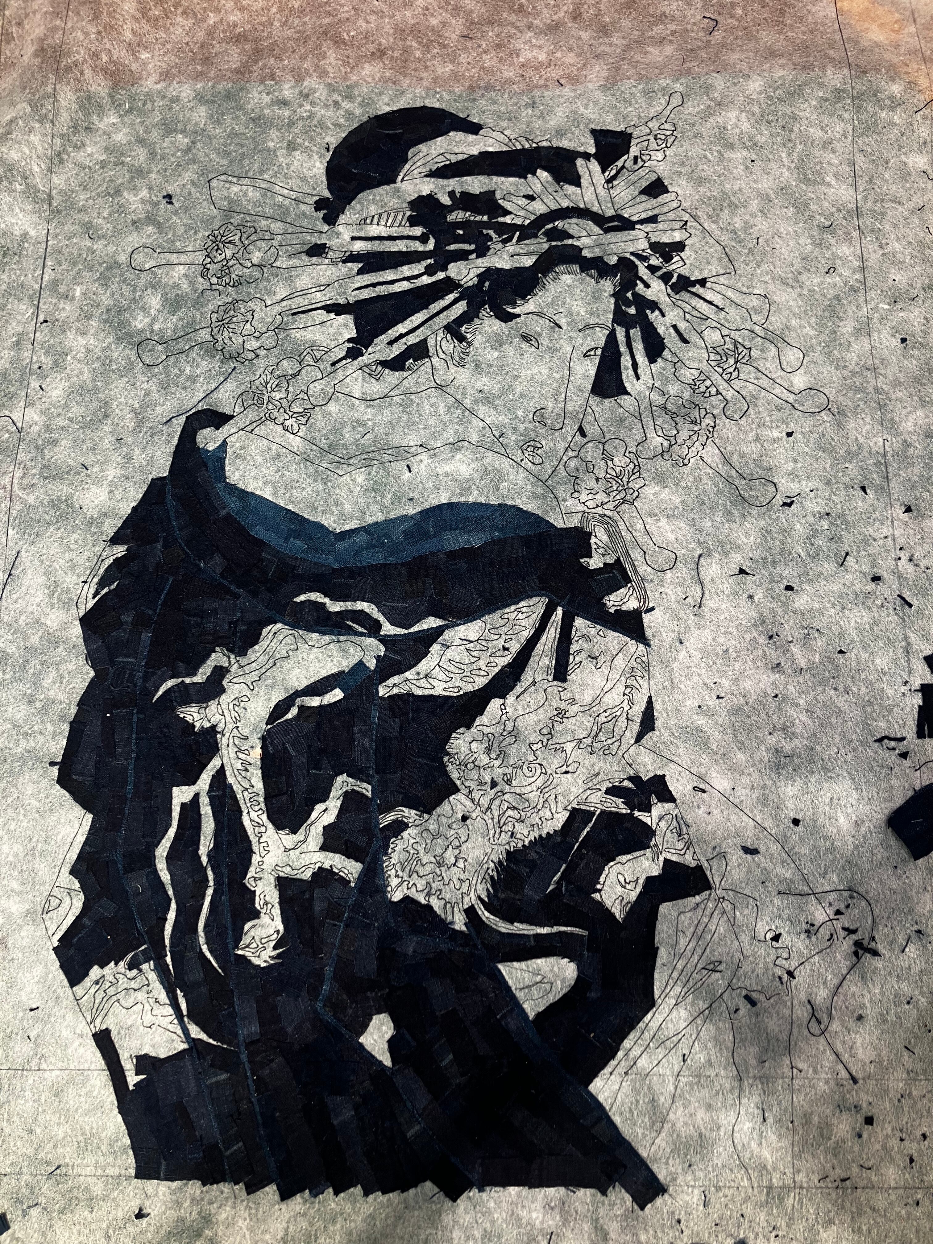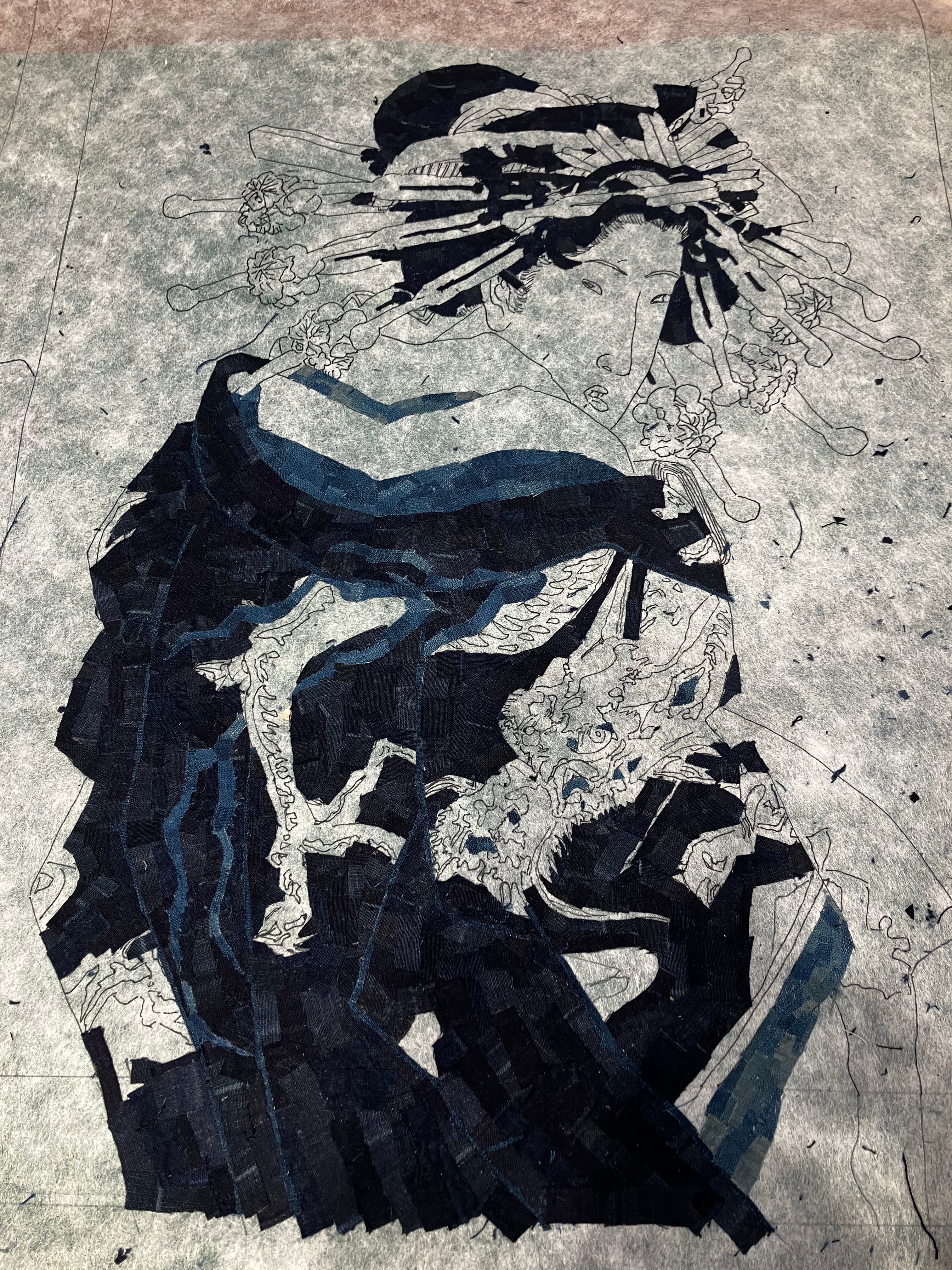 Part of the Indigo Legacies series, this artwork draws inspiration from the elegant and refined image of the Oiran, the high-ranking courtesans of Edo-period Japan. Adorned with elaborate hair ornaments and luxurious kimonos, the Oiran is depicted here in meticulous detail, crafted using scraps of indigo-dyed fabric. The subtle patterns in the background echo the aesthetic of ukiyo-e prints while offering a modern interpretation of traditional Japanese beauty.